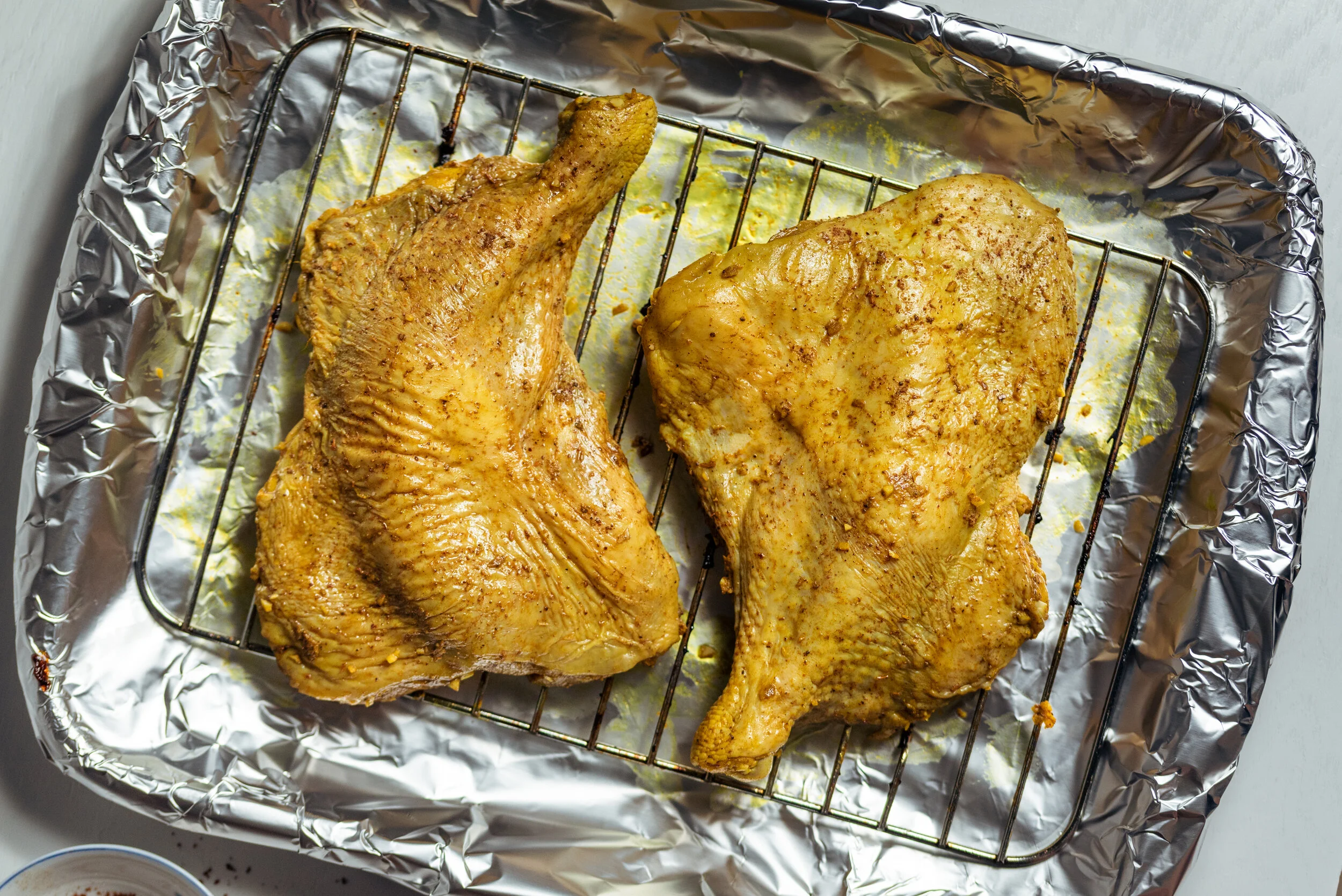 Working with chicken quarters, it’s really easy to butterfly your chicken. Butterflying your chicken serves multiple purposes. It creates more surface area for your chicken skin to be crispy and crackly. This technique allows the legs to soak up the marinade.